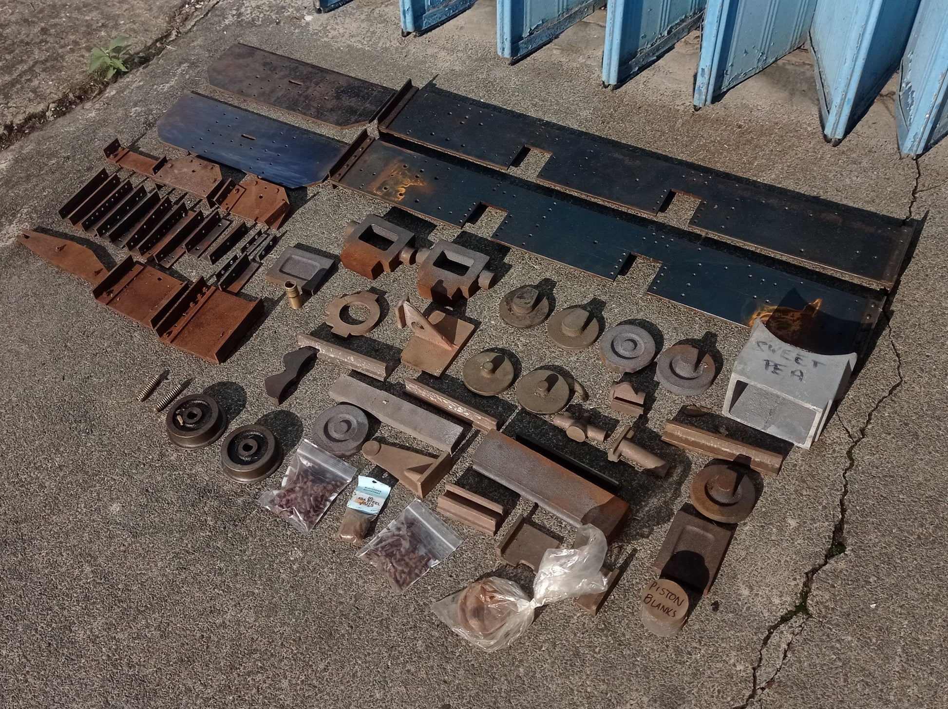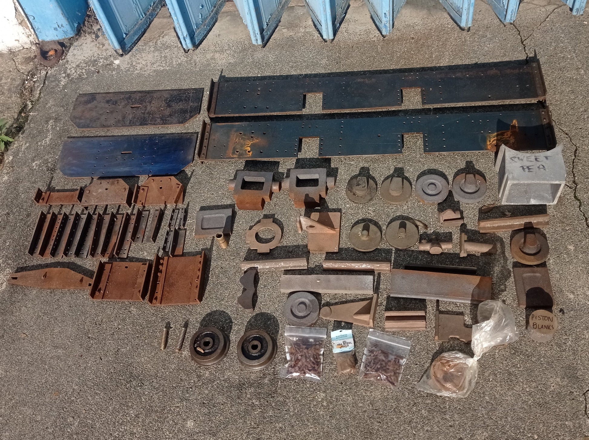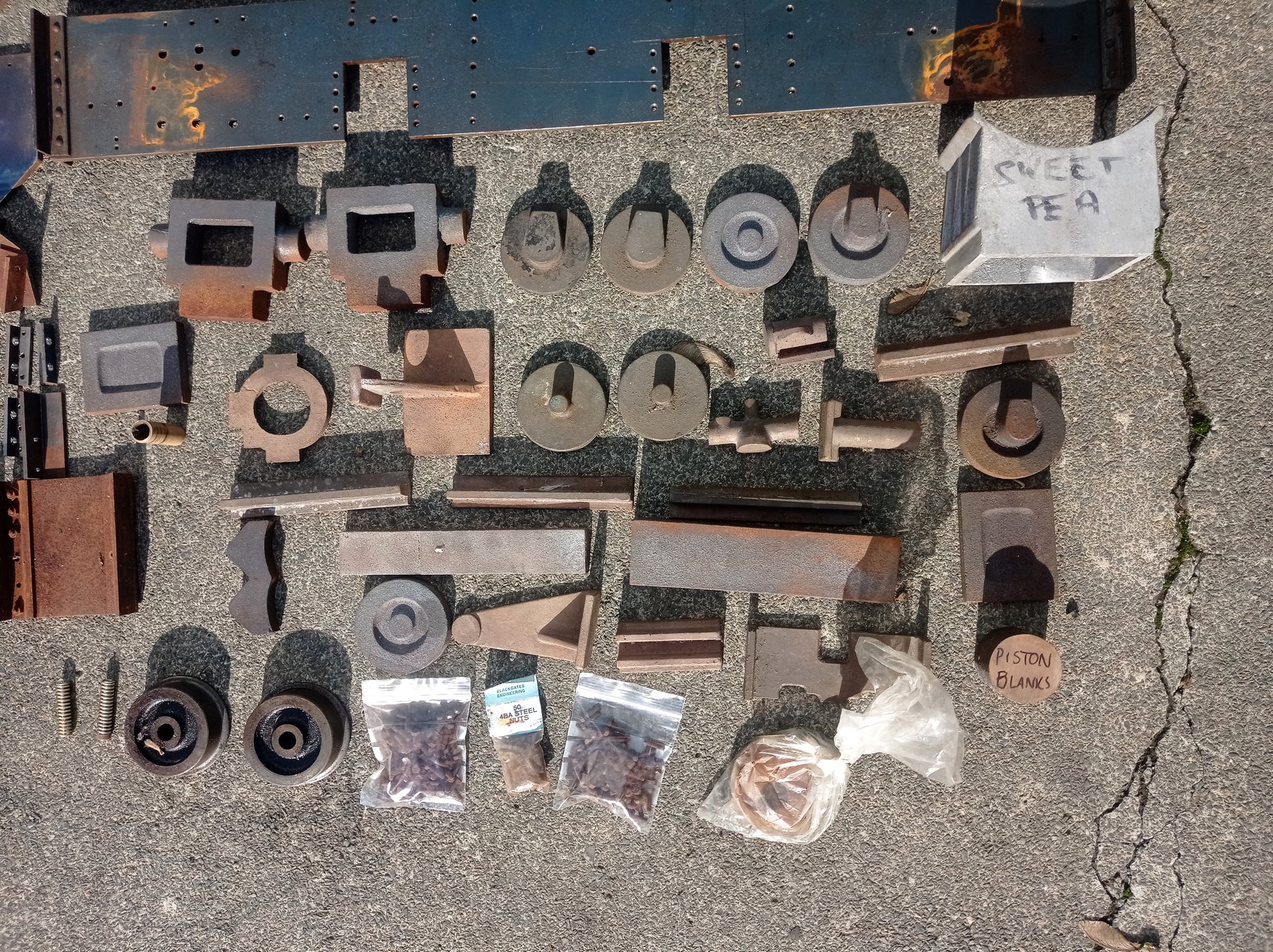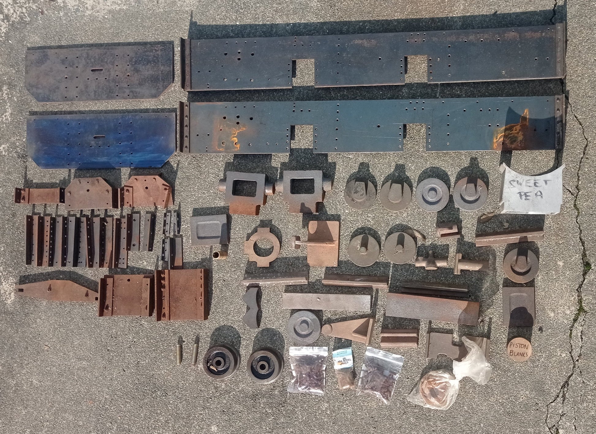 Pair of side frames and buffer beams for the popular 5" gauge Sweet Pea design, plus an assortment of Sweet Pea castings - driving wheels and cylinders are missing, but there is good selection of parts to start building this popular design.