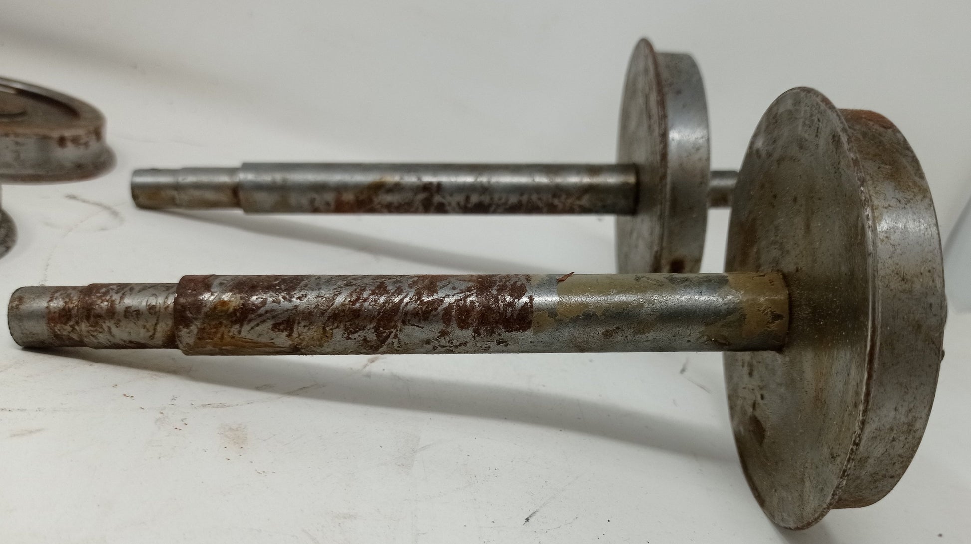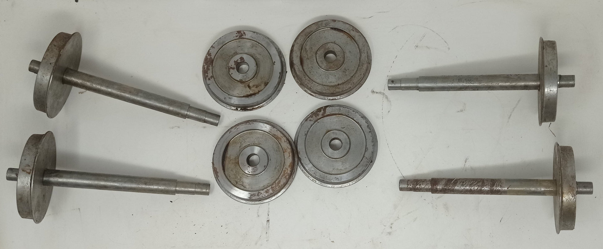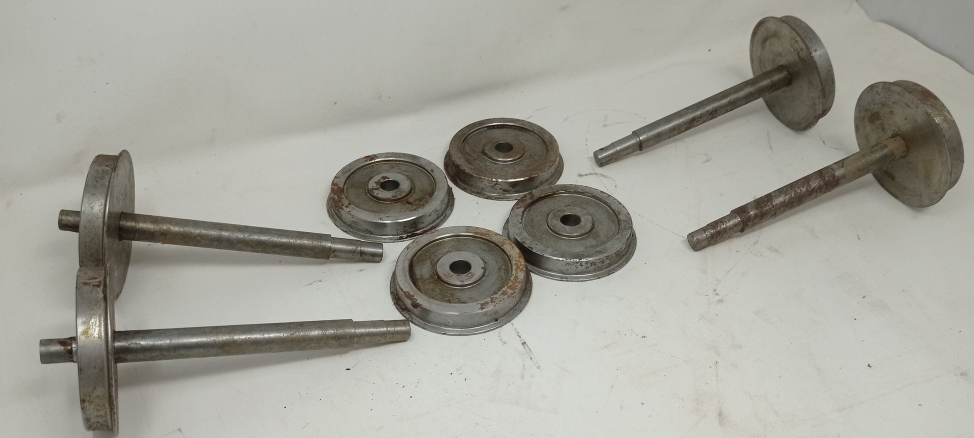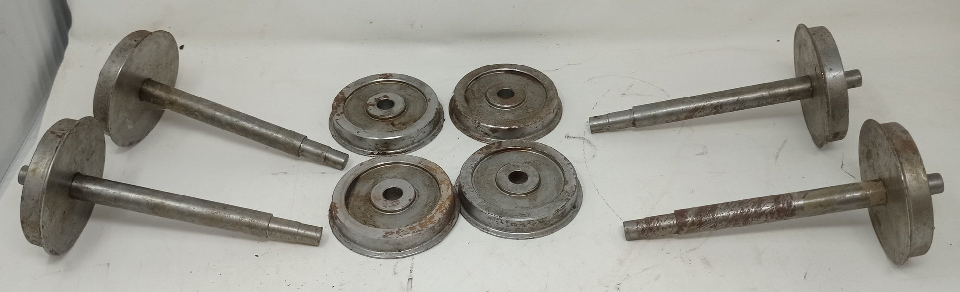 Four part assembled 5" gauge wheelsets - appear unused but with surface rust from storage. Each wheelset requires the second wheel pressing on.