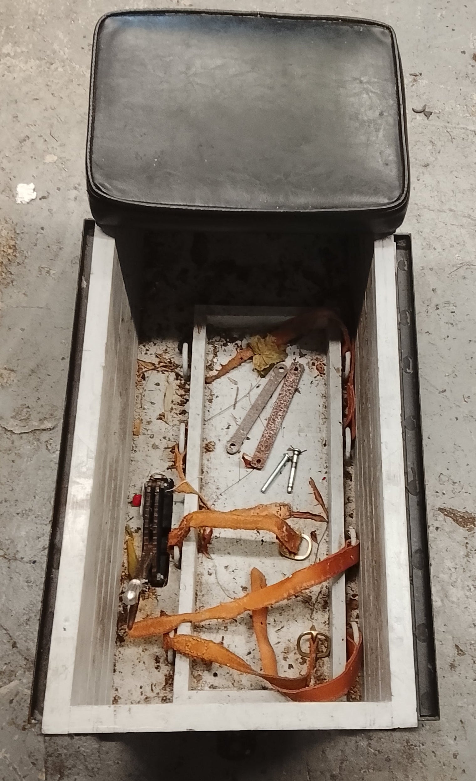 Plywood body mounted onto a welded steel chassis. The body has been extended upwards at some point in its life, and also fitted with a 'tray' to hold a battery.