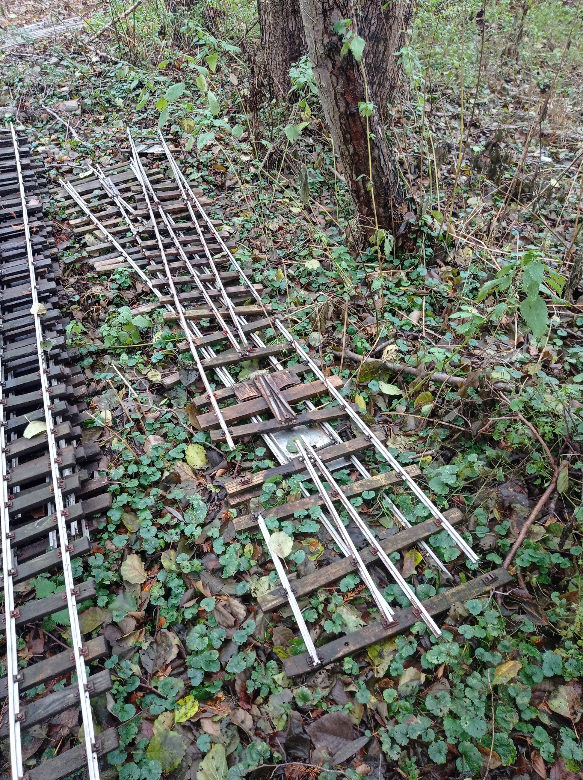 Used 7¼" gauge point, constructed from ⅝" high aluminium rail, cast crossing units and wooden sleepers