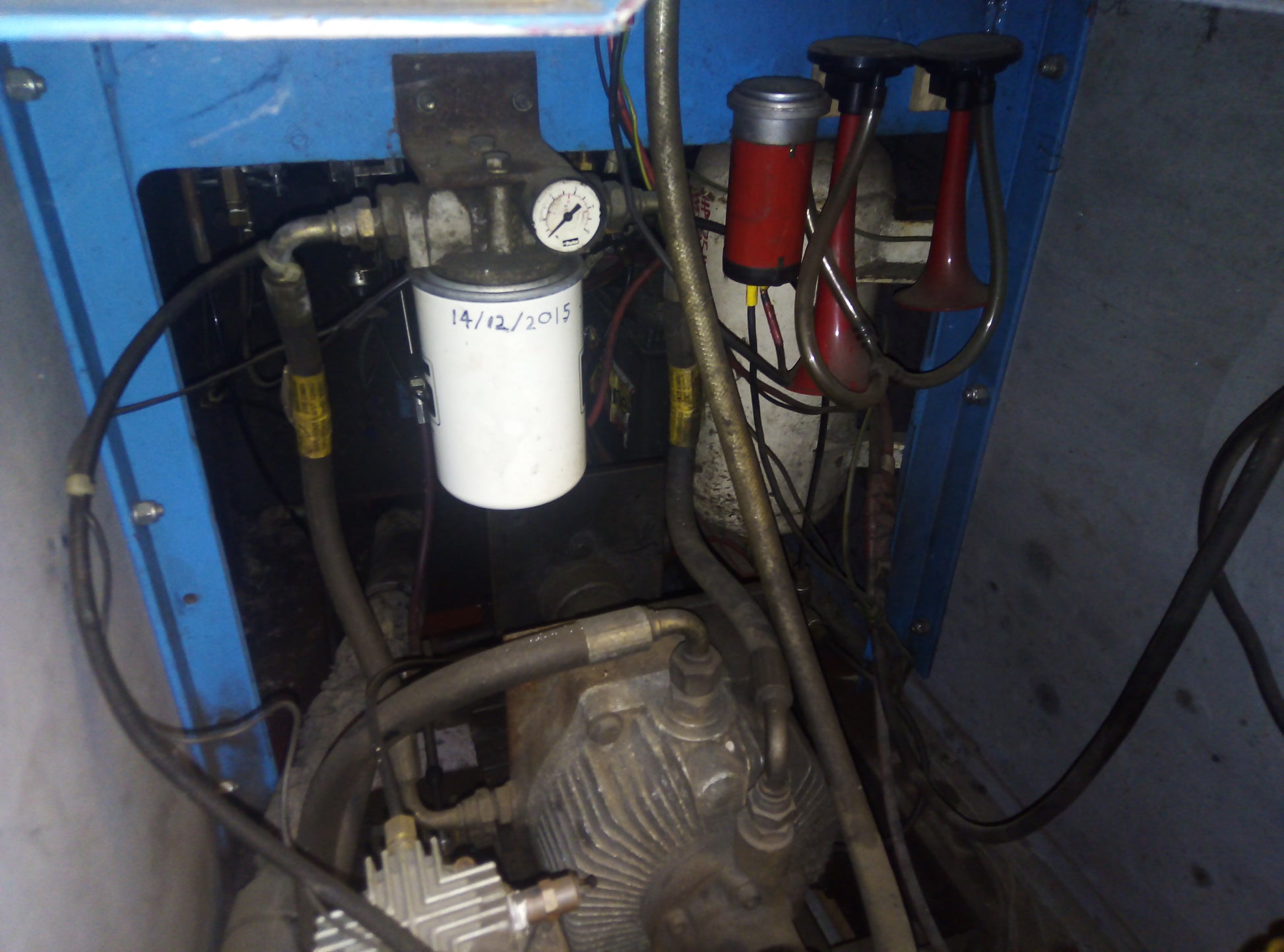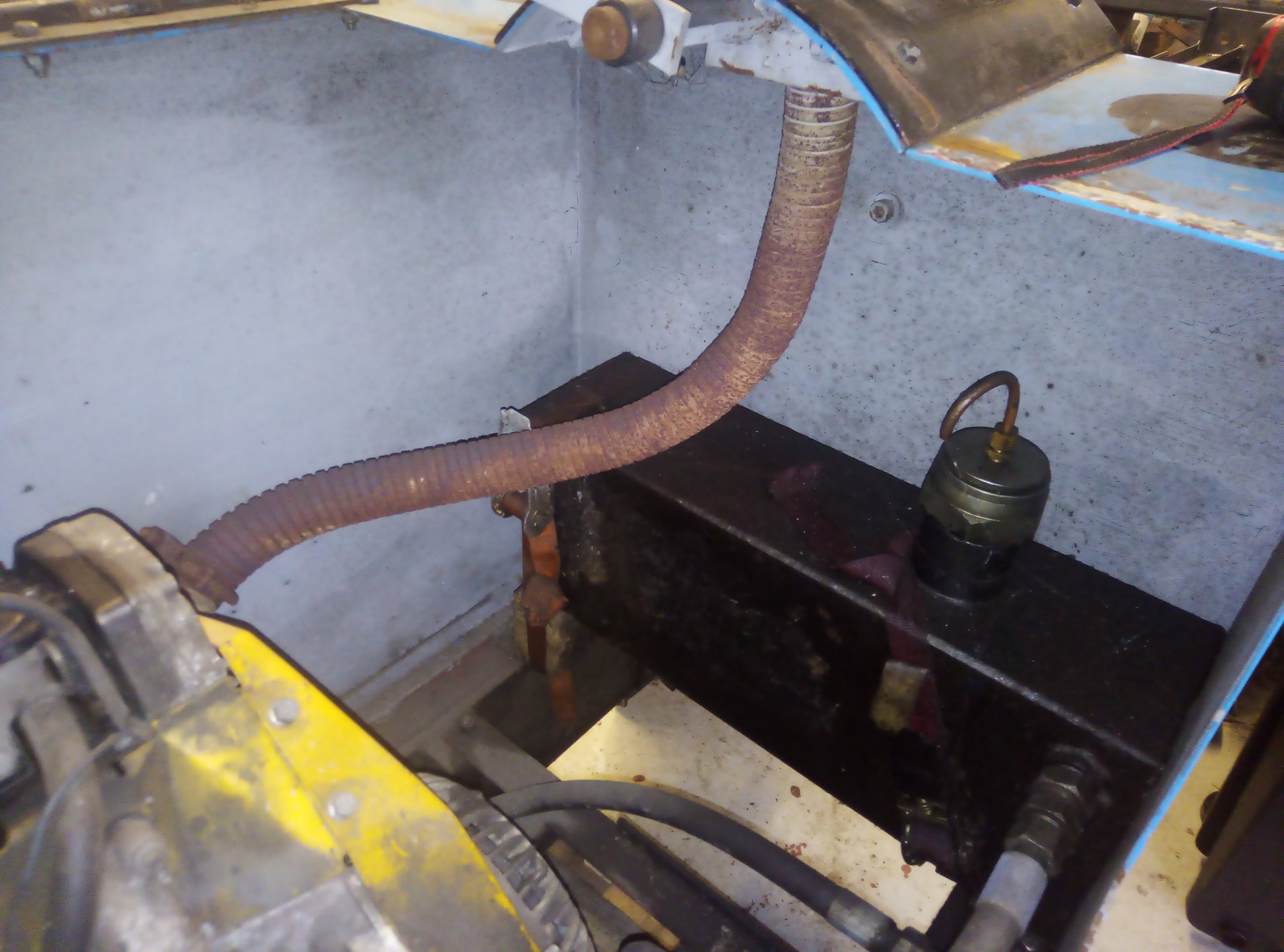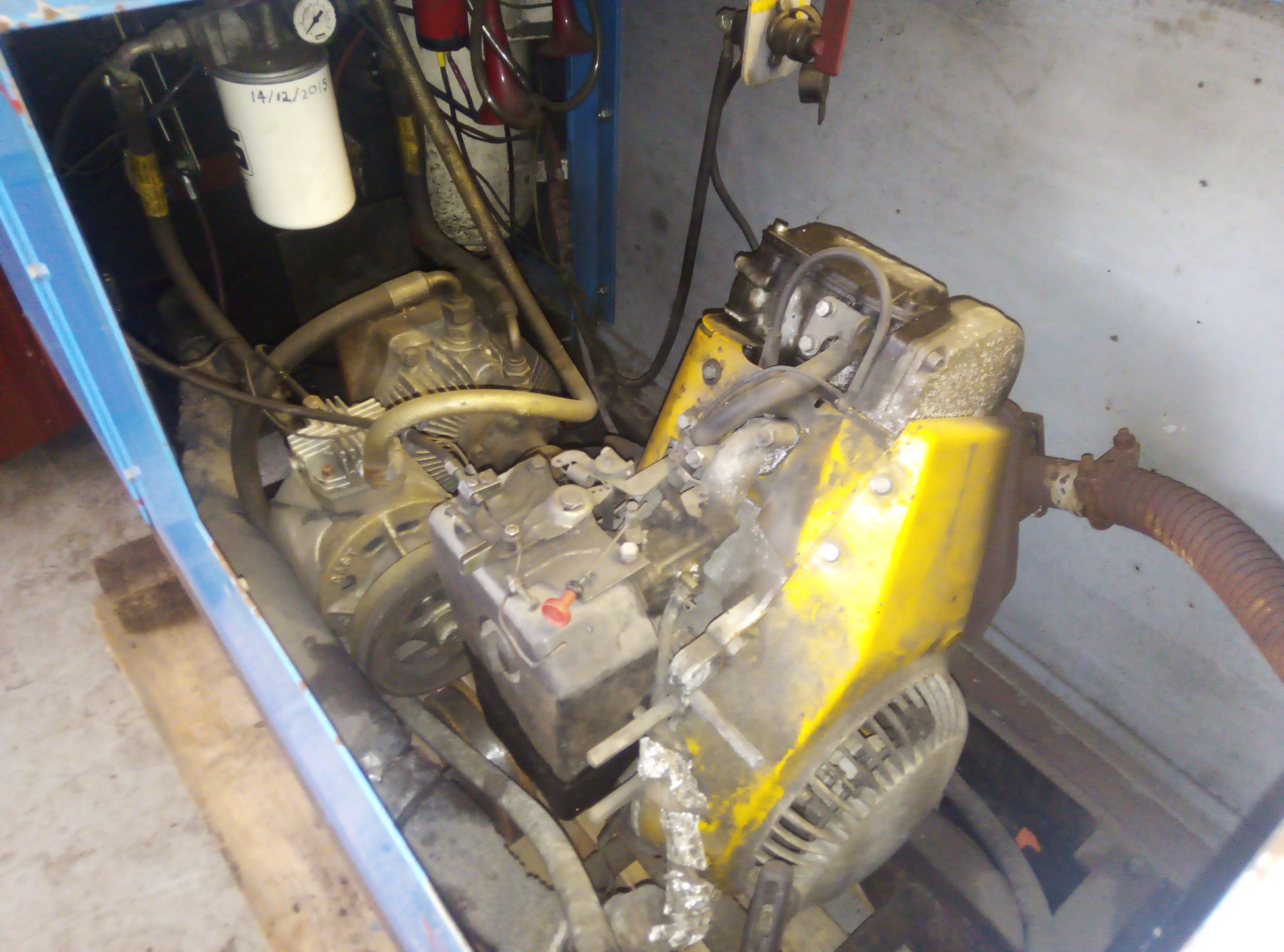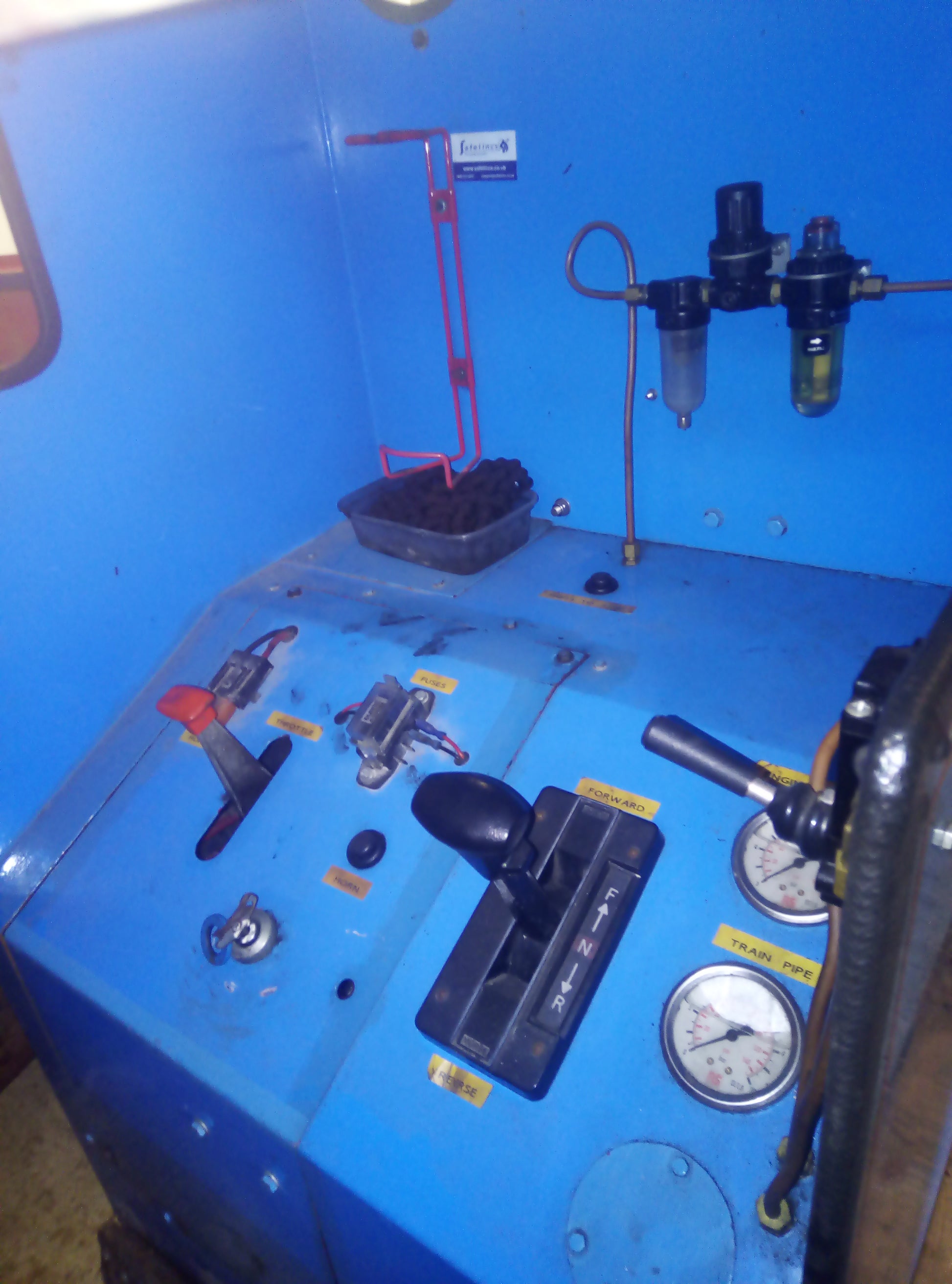 Single cylinder 9hp petrol engine driving an Eaton 11 hydrostatic unit, then through a 90 degree gearbox and chain drive to the rear axle. Fitted with belt driven air compressor and all the equipment for single pipe train air brakes.