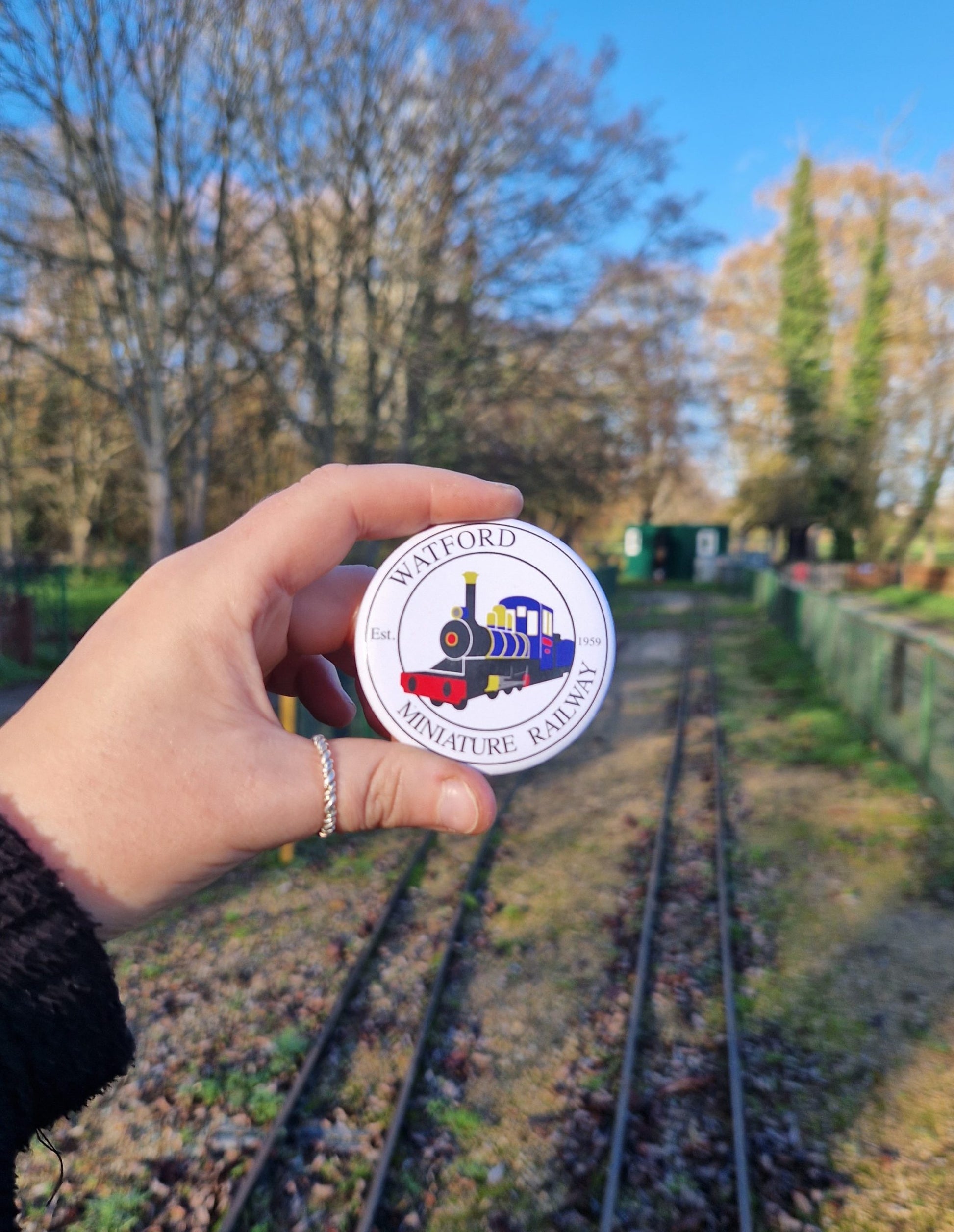 A round pin badge with the Watford Miniature Railway logo on, featuring our steam engine Marri.